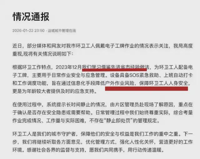 “情况说明”还说,“旨在通过信息化手段降低户外作业风险,保障环卫工人人身安全”。
